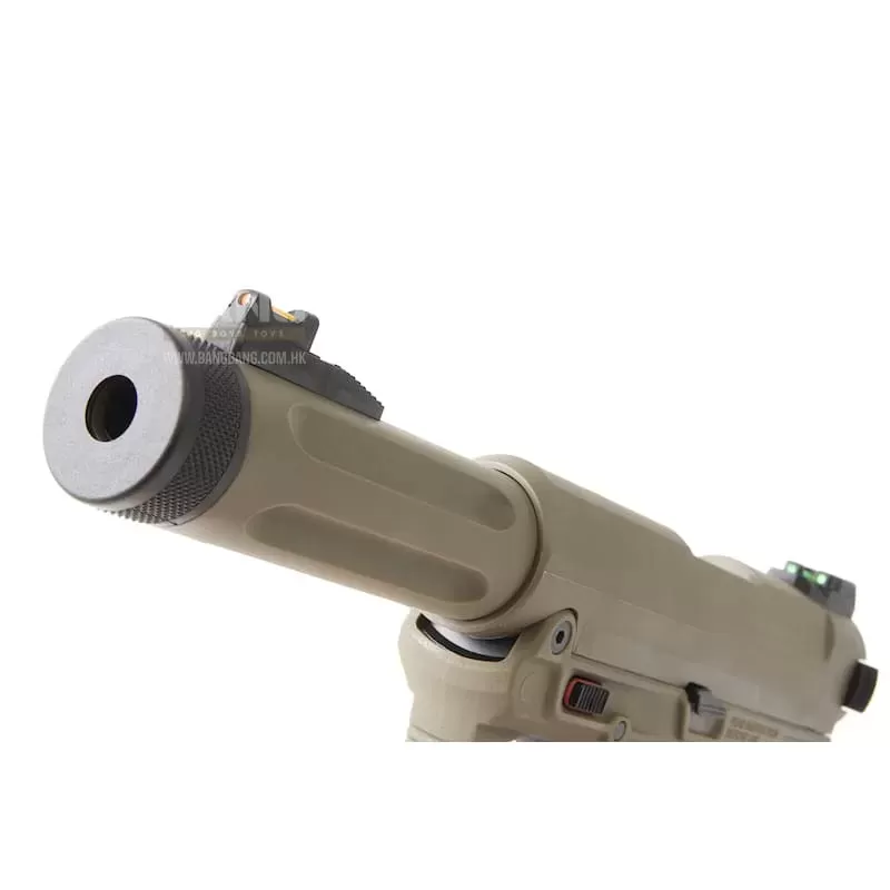 Internally the pistol functions like many other similar 'striker fired' pistols and has an adjustable hop up. Do make sure you take your time to adjust your hop up as out of the box the hop is non adjusted, which sometimes causes the chambered BB to fall out of the barrel. With addition of a threaded outer barrel, you can mount suppressors and other compensators with the compatible threads.