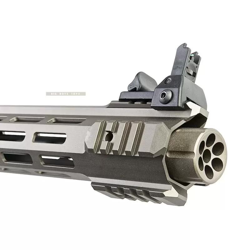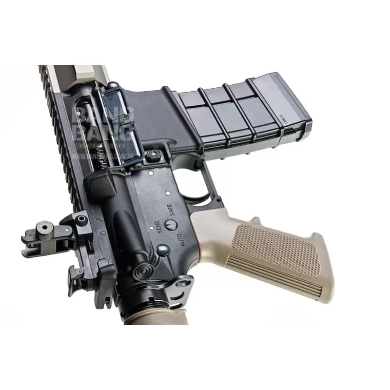 This KJ Works M4 GBBR is a face lifted, refreshed version of the KJ M4 GBBR. This particular rifle is light weight and designed to be CQB length. The rifle itself comes in a handsome two tone with the stock and rail being a tan/fde color. To cap it off, the rifle features a blast shield style muzzle device and flip up front and rear sights.