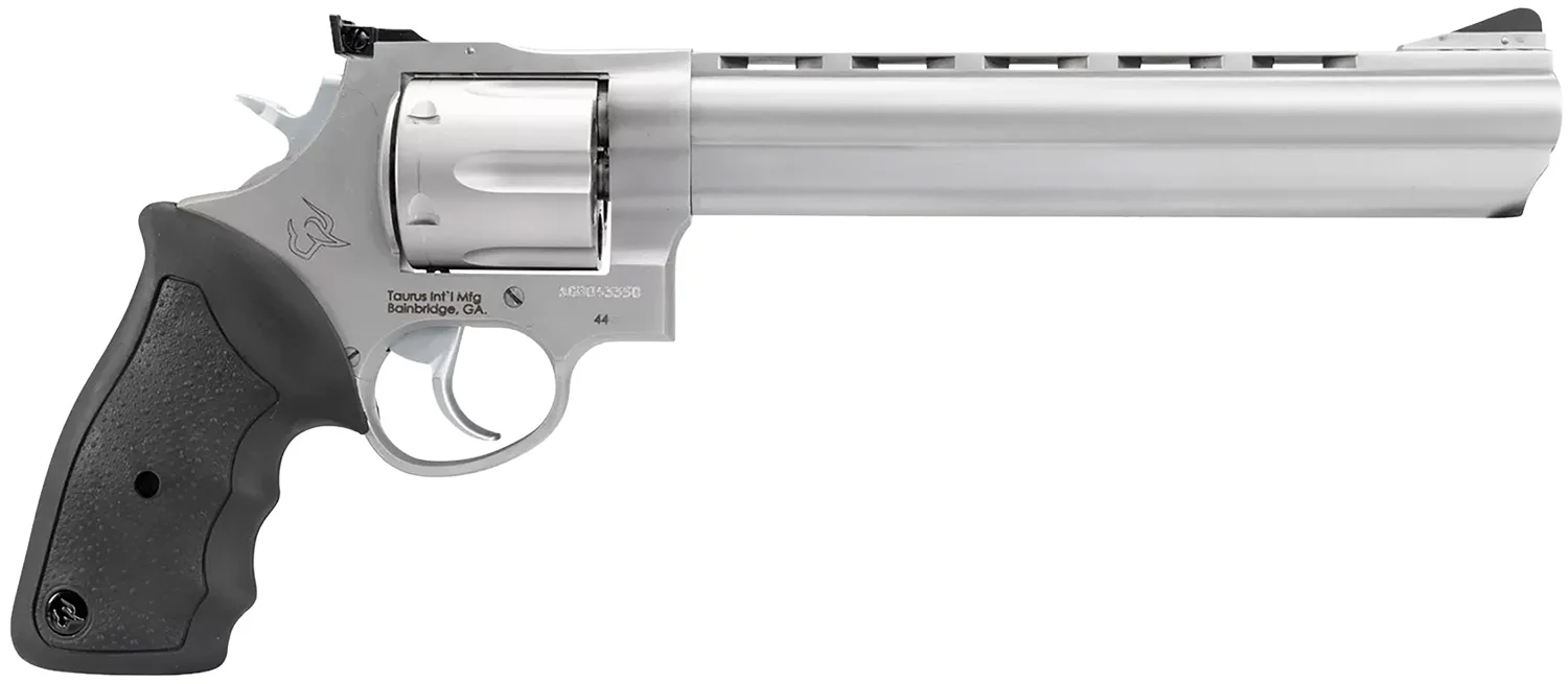 Taurus 2440089 44 Large Frame 44 Rem Mag 6rd 8.37 Matte Stainless Ported Barrel, Matte Stainless Cylinder Frame, Black Finger Groove Rubber Grip, Transfer Bar Safety Exposed Hammer - CLB Guns