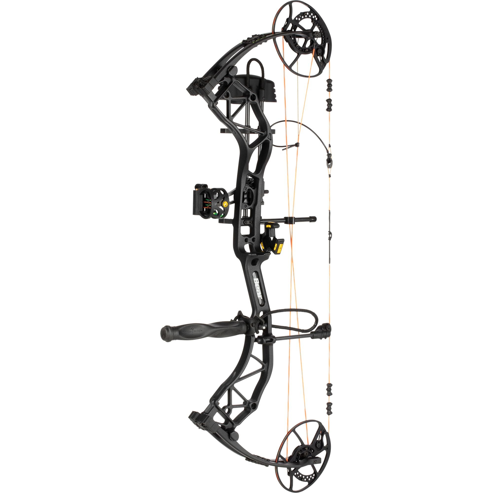 Bow comes ready-to-hunt with complete Trophy Ridge accessories: Joker 4-pin sight, 5-spot quiver, Blitz stabilizer, Whisker Biscuit V, peep sight, and D loop.