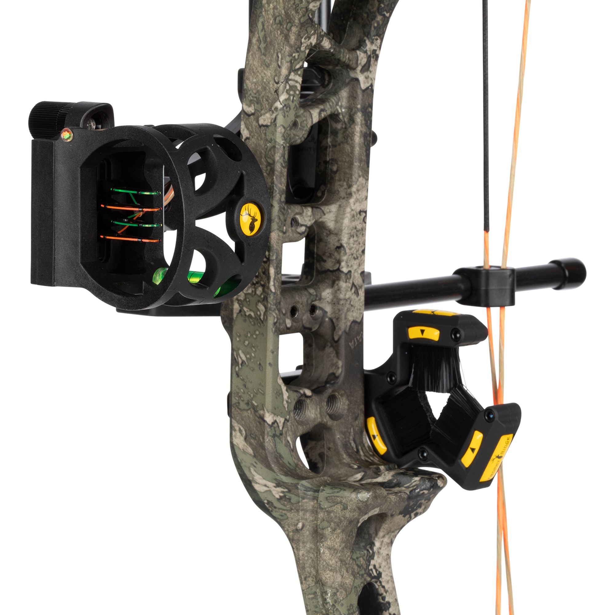 • Ready-To-Hunt package includes a Trophy Ridge Joker 4-pin sight, 5-Spot quiver, Whisker Biscuit V, Blitz stabilizer and wrist sling