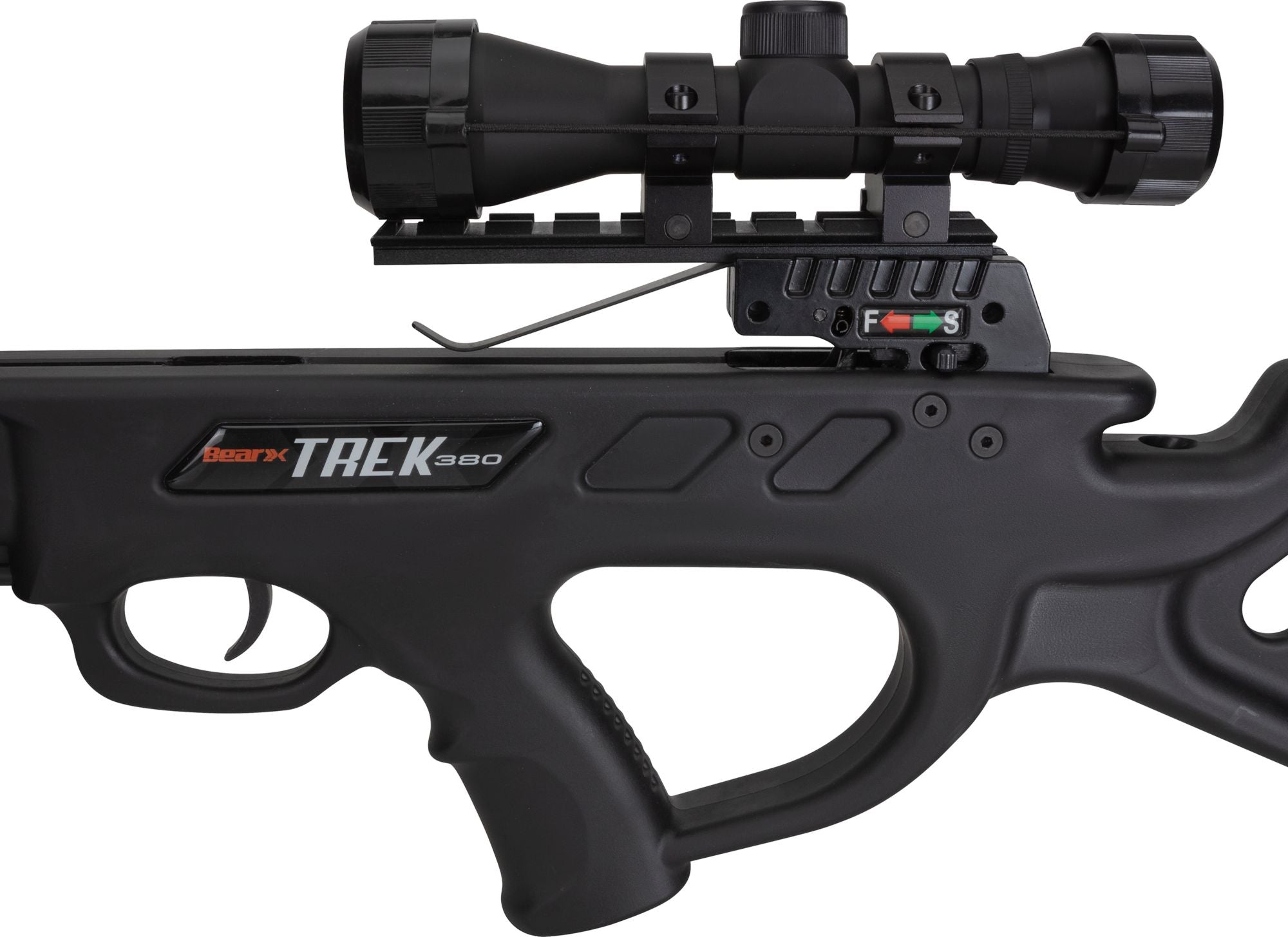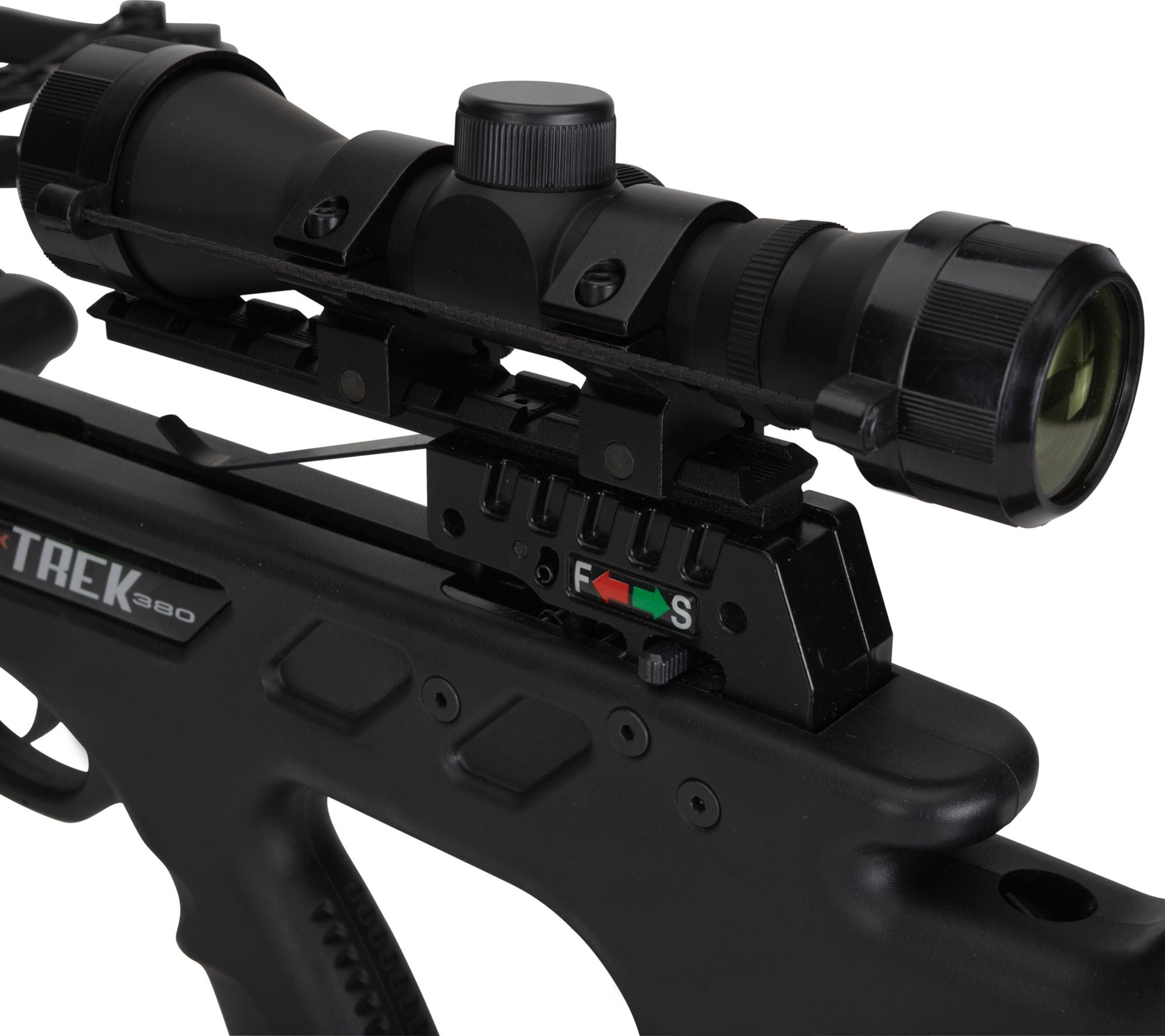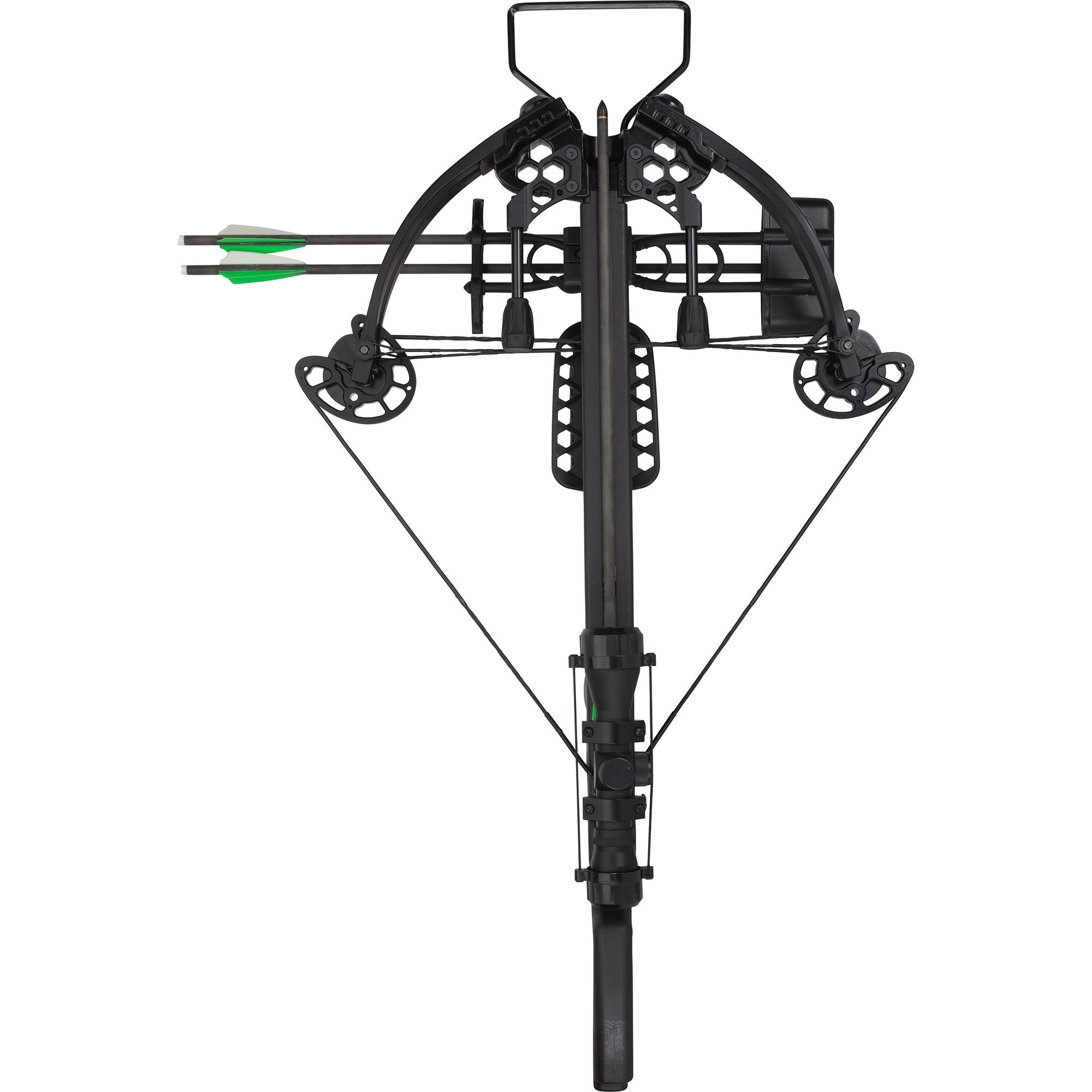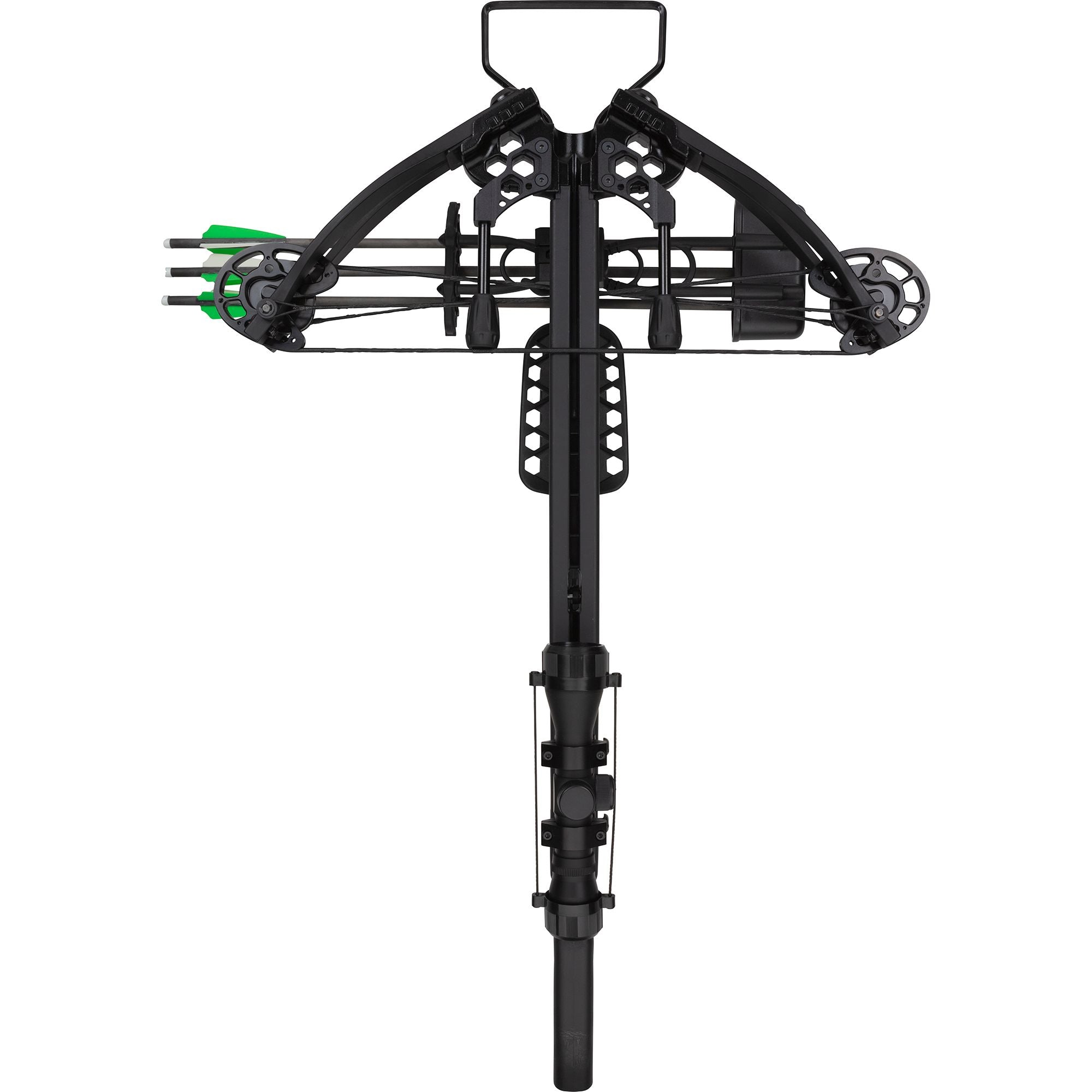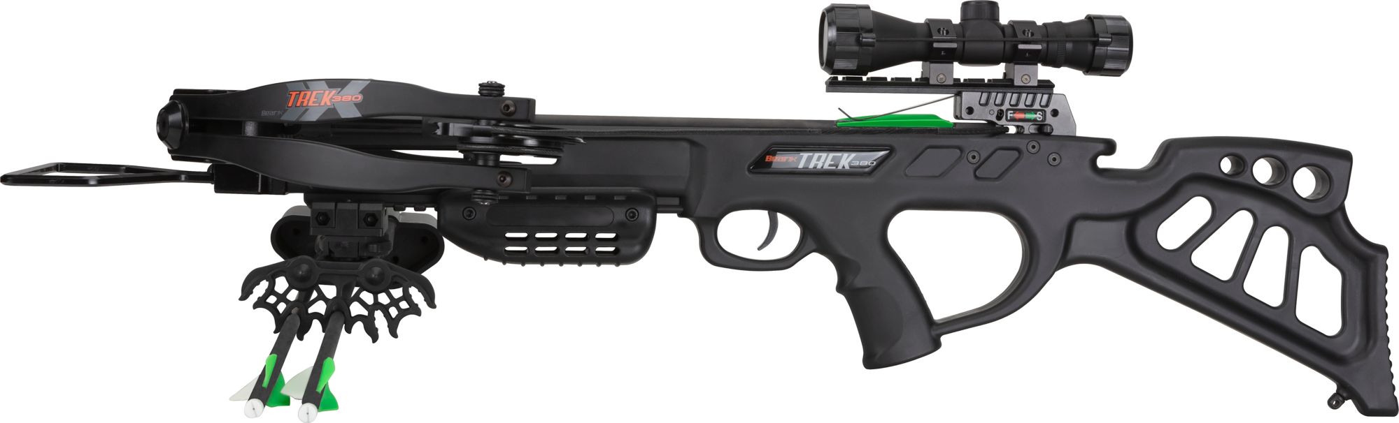 Ready to Hunt package includes: a 4x32 scope with multi cross-hair reticle with functioning eye piece, 5-arrow quiver, three carbon bolts with field points, cocking rope, and rail lube/string wax.