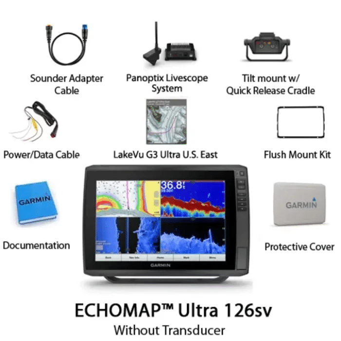 We aim to show you accurate product information. Manufacturers, suppliers and others provide what you see here, and we have not verified it. See our disclaimer Garmin ECHOMAP Ultra 126sv With Panoptix LiveScope & LakeVu g3 Ultra East Bundle Brand NewIncludes One Year Warranty The Garmin echoMAP Ultra 126sv Bundle includes ECHOMAP Ultra 126sv with Panoptix LiveScope System transducer & a LakeVu g3 Ultra HD US navigational software. The echoMAP Ultra 126sv is a 12 keyed-assist touchscreen combo with preloaded BlueChart g3 coastal charts and LakeV g3 inland maps. This echoMAP takes the ice fishing experience to an advanced level. The Garmin Panoptix LiveScope System is easy to adjust and fit the fishing techniques. It gives easy-to-interpret live scanning sonar images of structure, bait and fish swimming below and around the boat in real time, even when the boat is stationary. The Livescope modes provide accurate information of the range of 200 ft with an operating frequency of 530 - 1,100 kHz. The Garmin LakeV g3 Ultra HD U.S. - East contains detailed coverage of 11,500 HD East US lakes with 1 foot contours and more than 100 Garmin Elite survery lakes with integrated Garmin and Navionics data.Factory Information:User Manual---------> echoMAP Ultra 126sv Features: Chartplotter/Fishfinder Combo 12' WXGA Touchscreen Display BlueChart g3 & LakeV g3 Maps Water Temperature Log & Graph Preloaded Quickdraw Contours Mapping Software Built-in Wi-Fi Connectivity NMEA 2000 connectivity IPX7 Water Rating