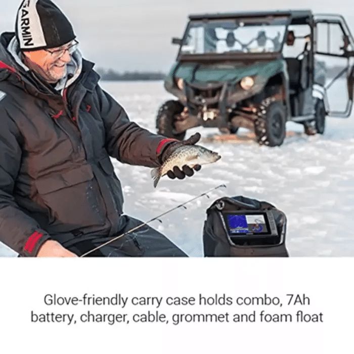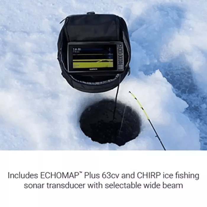 We aim to show you accurate product information. Manufacturers, suppliers and others provide what you see here, and we have not verified it. See our disclaimer Search frozen lakes with this Garmin ECHOMAP Plus ice fishing bundle It comes in a rugged glove-friendly carrying case, and the high wide CHIRP transducer has a built-in flasher for precise fish and jig detection The GPS unit of this Garmin ECHOMAP Plus ice fishing bundle has a 6-inch keyed display for viewing maps and sonar data Features: Includes ECHOMAP Plus 63cv combo with GT8HW-IF ice fishing transducer featuring Garmin CHIRP traditional sonar with selectable wide beam angle 16 to 24 degrees Built-in flasher provides precise jig and fish detection Preloaded LakeVu HD maps provide industry-leading detail on more than 17,000 US lakes Supports ClearVu scanning sonar for nearly photographic images of whats below the boat transducer sold separately Rugged, glove-friendly portable carrying case holds ECHOMAP Plus 63cv, 7Ah battery, charger, power cable, grommet and foam float Includes ECHOMAP Plus 63cv combo with GT8HW-IF ice fishing transducer featuring Garmin CHIRP traditional sonar with selectable wide beam angle (16 to 24 degrees) Built-in flasher provides precise jig and fish detection Preloaded LakeVu HD maps provide industry-leading detail on more than 17,000 U.S. lakes
