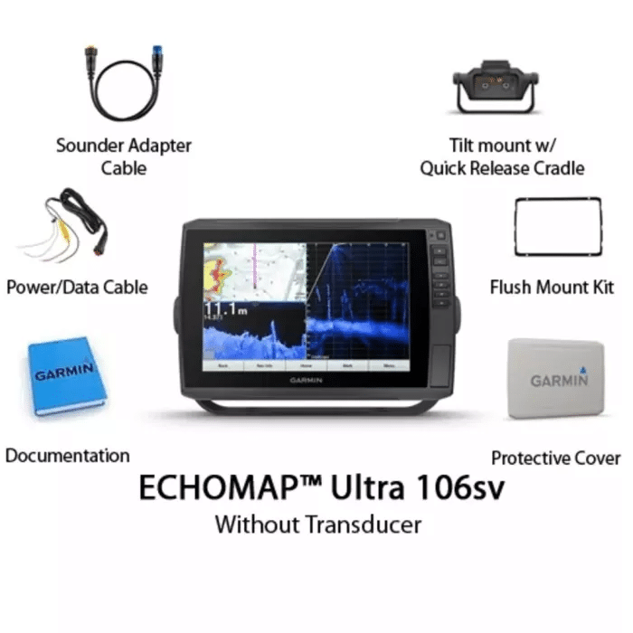 We aim to show you accurate product information. Manufacturers, suppliers and others provide what you see here, and we have not verified it. See our disclaimer Garmin echoMAP Ultra 106sv Product # 010-02112-00 (w/o Transducer) The Garmin echoMAP Ultra 106sv is a 10 Inch keyed-assist touchscreen combo with preloaded BlueChart g3 coastal charts and LakeVu g3 inland maps. This echoMAP takes the ice fishing experience to an advanced level. It pairs an echoMAP ultra 106sv Combo with sonar and share sonar, waypoints and routes with other echoMAP Ultra 10 Inch and 12 Inch units as well as echoMAP Plus 7 Inch and 9 Inch units. The built-in Quickdraw Contours mapping software helps to create personalized fishing map on screen. The echoMAP Ultra 106sv provides Wi-Fi connectivity with the help of free ActiveCaptain app along with NMEA 2000 connectivity which provides support to connect sensors, autopilots, digital switching, weather, FUSION-Link audio system and more. It includes built-in support for traditional CHIRP, CHIRP ClearVu and CHIRP SideVu scanning sonars, ultra high-definition scanning sonar and Panoptix LiveScope LVS12 sonar along with full line of Panoptix all-seeing sonar transducers. echoMAP Ultra 106sv Features: - Chartplotter/Fishfinder Combo - 10 Inch WXGA Touchscreen Display - BlueChart g3 & LakeVu g3 Maps - Water Temperature Log & Graph - Preloaded Quickdraw Contours Mapping Software - Built-in Wi-Fi Connectivity - NMEA 2000 connectivity - IPX7 Water Rating