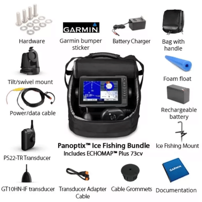 We aim to show you accurate product information. Manufacturers, suppliers and others provide what you see here, and we have not verified it. See our disclaimer Locate fish below the ice quickly and precisely with this Garmin Panoptix ice fishing bundle It includes an ECHOMAP Plus thats capable of three sonar types, including traditional narrow beam CHIRP and LiveVu forward/down for flexibility This Garmin Panoptix ice fishing bundle is preloaded with maps of over 17,000 lakes, and the rugged case is ready for anything Features: Includes ECHOMAP Plus 73cv combo with 3 types of sonar: narrow beam Garmin CHIRP traditional and a Panoptix PS22 transducer with LiveVu Forward and LiveVu Down GT10HN-IF ice fishing transducer with Garmin CHIRP traditional sonar and narrow beam angle 8 to 16 degrees for precise fish and jig detection Preloaded LakeVu HD maps provide industry-leading detail on more than 17,000 lakes Ability to create custom combination screen to include flasher, map and Panoptix views Rugged, portable carrying case fits all included parts and is perfect for ice fishing Specifications: Physical dimensions: 98'x55'x2' 25cmx139cmx51cm Weight: 17 lbs 077kg Water rating: IPX7 Display type: WVGA display Display size: 60'x36'; 70' diagonal, 152 x 91 cm; 178cm diagonal Display resolution: 800 x 480 pixels Power consumption: 62W Antenna: Internal_or_external_over_NMEA_2000 Receiver: 5 Hz Garmin Marine Network ports: 1 Panoptix port Includes ECHOMAP Plus 73cv combo with 3 types of sonar: narrow beam Garmin CHIRP traditional and a Panoptix PS22 transducer with LiveVu Forward and LiveVu Down GT10HN-IF ice fishing transducer with Garmin CHIRP traditional sonar and narrow beam angle (8 to 16 degrees) for precise fish and jig detection Preloaded LakeVu HD maps provide industry-leading detail on more than 17,000 lakes