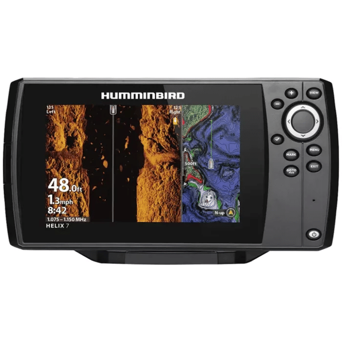 We aim to show you accurate product information. Manufacturers, suppliers and others provide what you see here, and we have not verified it. See our disclaimer HELIX 7 CHIRP GPS fishfinders feature Dual Spectrum CHIRP Sonar, AutoChart Live, GPS and Humminbird Basemap built-in. The 7', ultra-wide display gives you ample room to view the many pre-loaded split screen view options. Dual Spectrum CHIRP: Well-defined fish arches with a clear view of fish-holding structure and the bottom. Proprietary, Low Q CHIRP transducer, Dual Spectrum wide mode for max coverage and narrow mode for max detail. SwitchFire Sonar: Easily add or remove detail, account for water depth, temperature and turbulence, even watch lure presentations. Basemap Built-in: Underwater terrain and surrounding points of interest - fish and navigate with confidence. Identify buoys, day markers, hazards, marinas, contours, depth markers and much, much more. Includes charts of more than 10,000 lakes, plus coastal coverage for the U.S. AutoChart Live: Create real-time maps of fishing spots, with access to Humminbird LakeMaster features. Map depth contours, bottom hardness and vegetation with 8 hours of recording time. LakeMaster Compatible: Upgrade to easy-to-read contours, highlighted depth ranges and scrollable lake lists. Includes transducer and mounting hardware, power cable, gimbal mounting bracket.MEGA DI Down Imaging Units: Coverage down to 125'. Up to 3X more output than standard Down Imaging sonar.MEGA SI Side Imaging Units: Crystal-clear viewing 125' on either side of your boat. Up to 3X more output than standard Side Imaging sonar.NAV+ Units: Include Navionics+ (U.S. and Canada) SD card of over 21,000 lakes and waterbodies.MEGA DI CHO Control Head Only Units: Transducer is not included. Compatible with Minn Kota Built-in MEGA DI trolling motors.G3N Networking/Bluetooth Units: High-speed Ethernet Networking to connect multiple fish finders, or upgrade to add-on technologies like Minn Kota i-Pilot Link, 360 Imaging and CHIRP Radar. Bluetooth enables features like wireless software updates from the Humminbird FishSmart App and display phone notifications on your Humminbird. Control your most-used features with an optional Bluetooth remote (RC2).