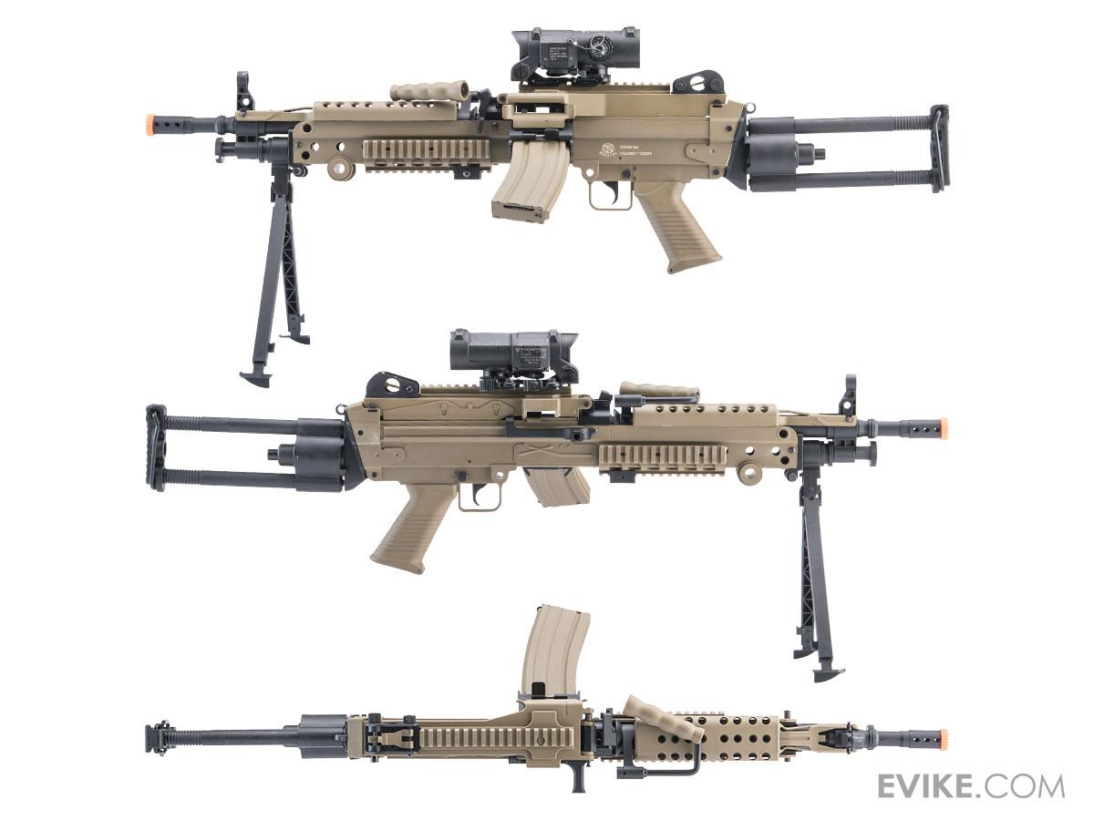 Based on the FN Minimi, the M249 uses a 5.56x45mm NATO cartridge in a belt-fed configuration, supplied from a plastic box magazine. In a pinch, you may also use STANAG compatible M16 magazines in this weapon system. Over the years the M249 has seen quite a few variants, all purpose-tailored to individual's needs.