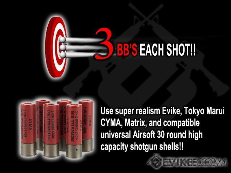 Magazine Capacity: 30rds per Shell (takes Evike/Marui/CYMA 14 round type or 30 round type shells)