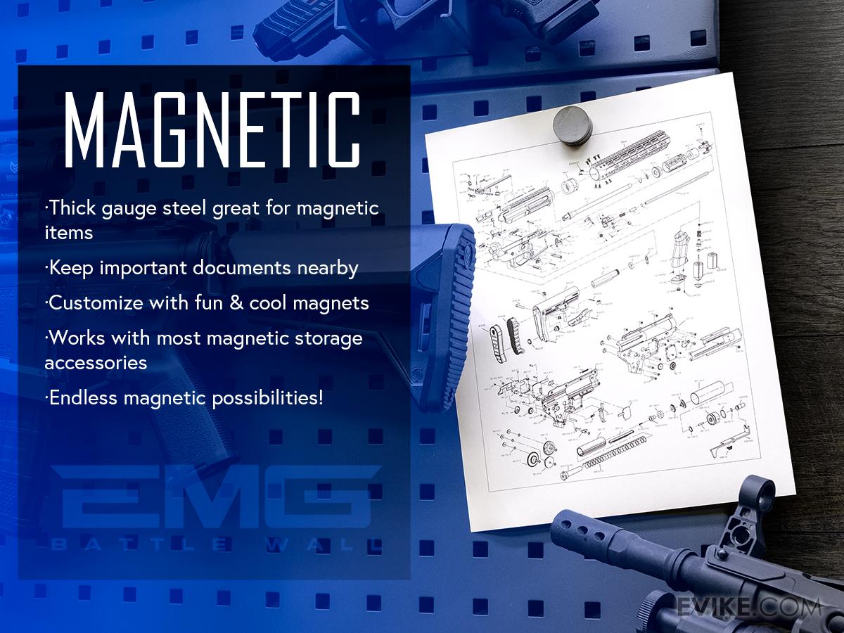Battle Wall panels are available in multiple sizes to fit into whichever space you desire. Thanks to the unique Battle Square connector design, panels can be mounted vertically or horizontally and work with a full array of hangers, hooks, and organizational accessories. Panels are made from heavy-duty 14 gauge steel and are coated in a wear-resistant satin finish for maximum durability and lifespan.