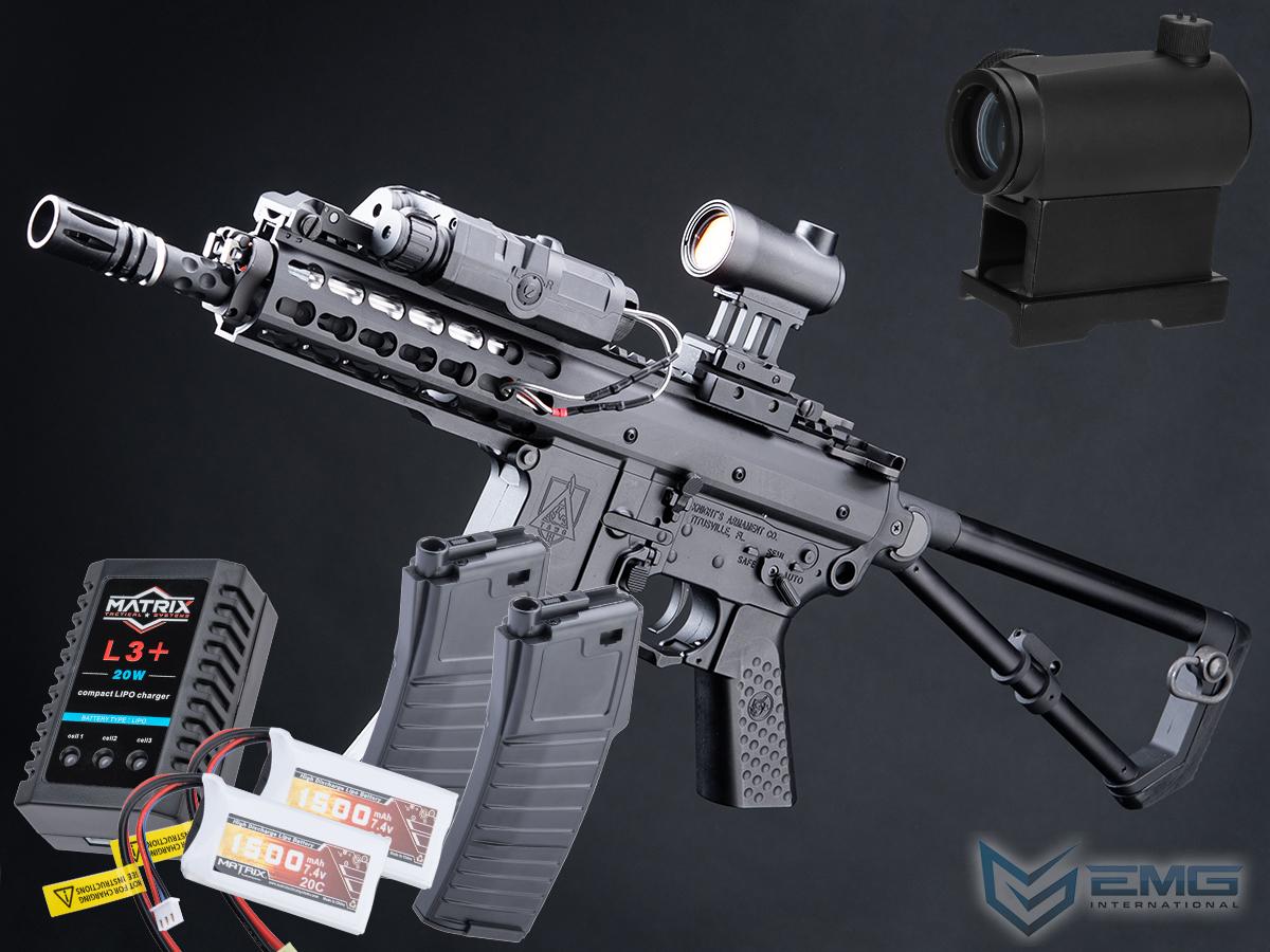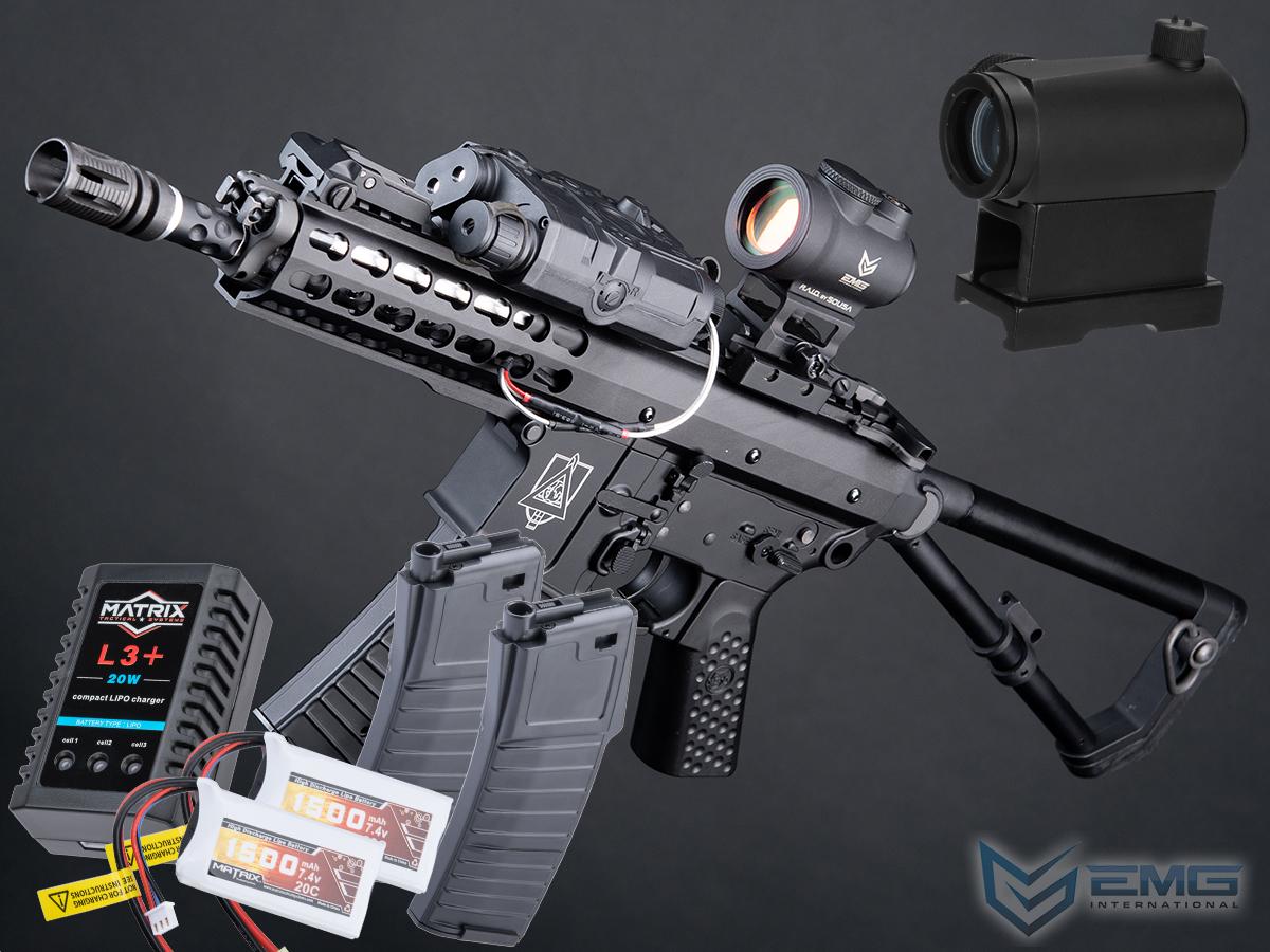 Package Includes: Gun, High Cap Magazine, 2x Spare PDW Mid-Cap Magazines, T1 style Red Dot Optic, 2x Matrix 7.4v LiPo Batteries, LiPo Balancing Smart Charger, LiPo Safe Charging Bag, Airsoft Safety Sack