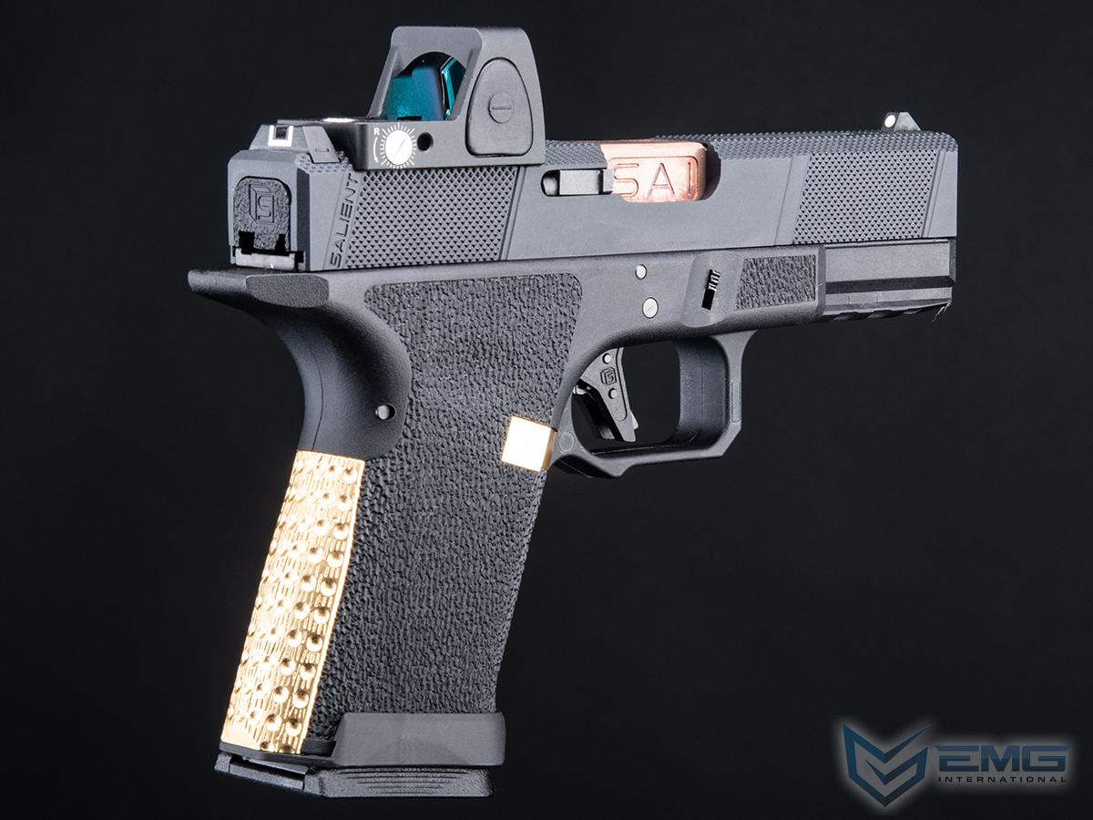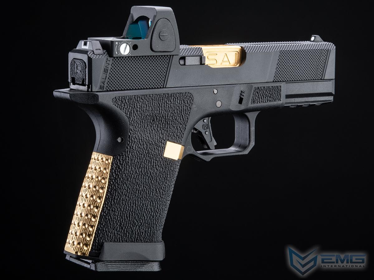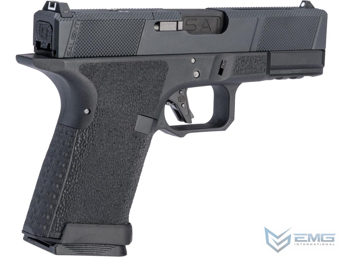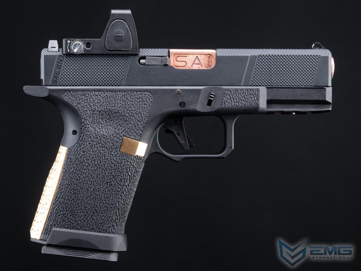 EMG has furthered their collaboration with Salient Arms International with a new pistol as the platform. Designed closely with the geniuses at SAI, the EMG / SAI Tier One Utility Package is designed to be as close to the real thing as possible offering shooters and enthusiasts the most realistic training analog available. Using the popular EMG Salient Arms International BLU Compact as the base, the Tier One Utility Package Pistol features a machined aluminum slide with hyper-aggressive front, rear, and top knurling to greatly improve grip no matter the situation. The Titanium Nitride styled box fluted barrel from Salient Arms comes standard with this pistol. Authentic rollmarks and branding top off the look, making it almost impossible to differentiate the 6mm version, from the 9mm version.