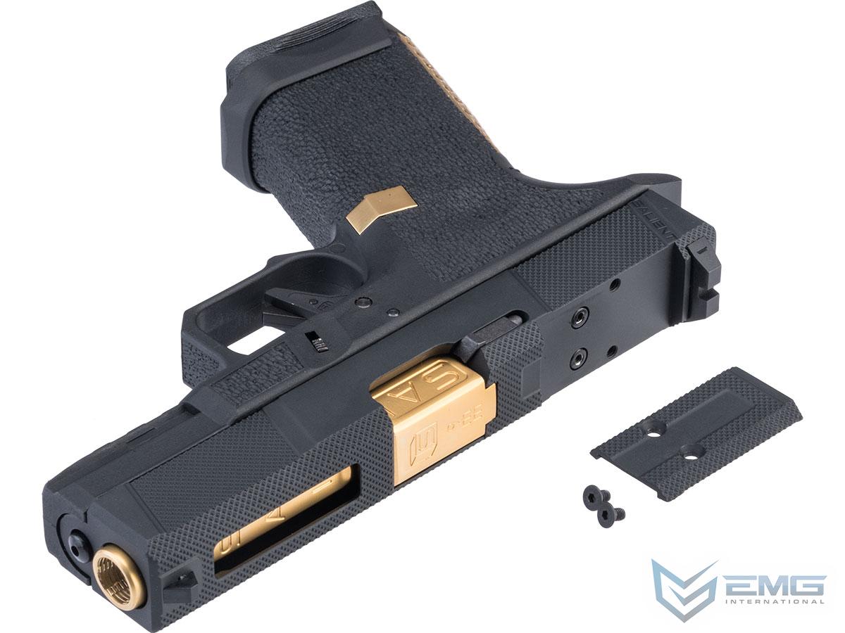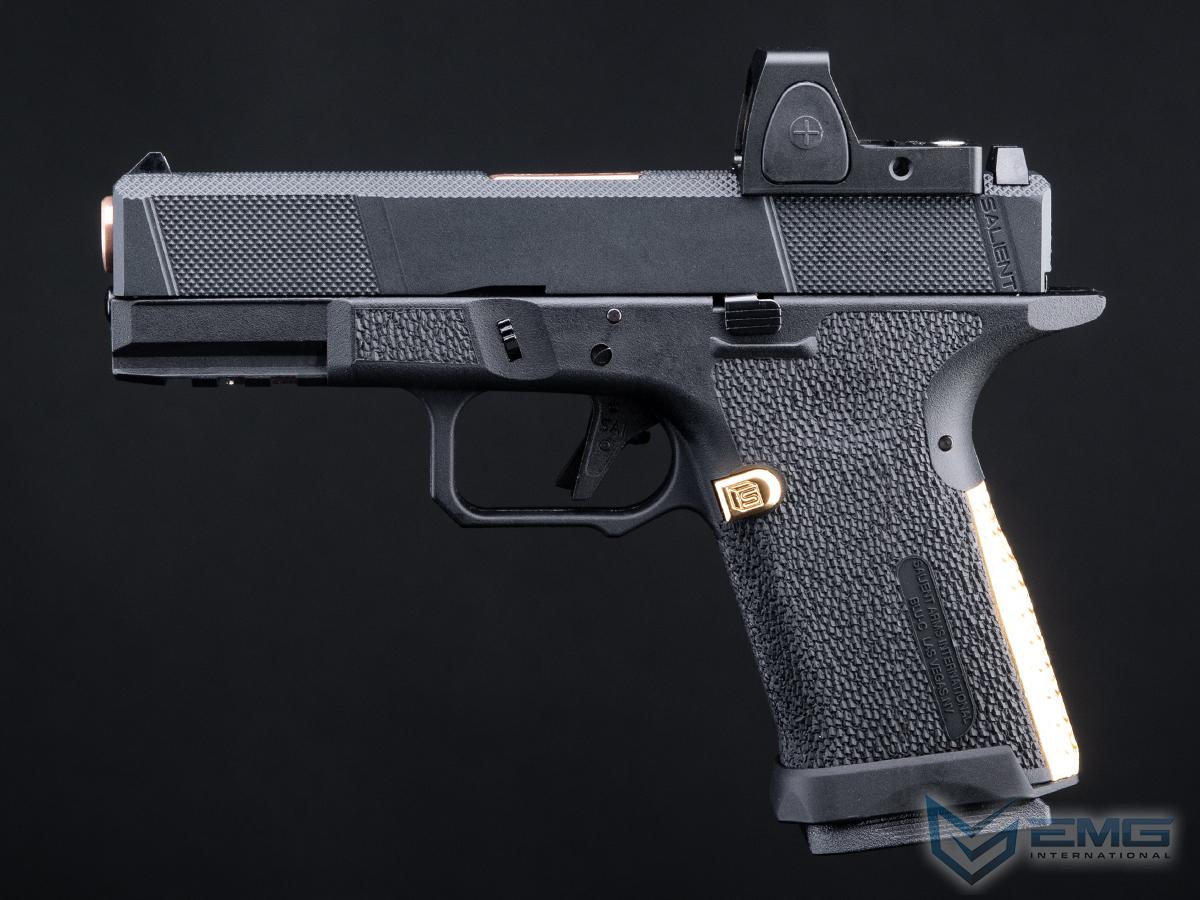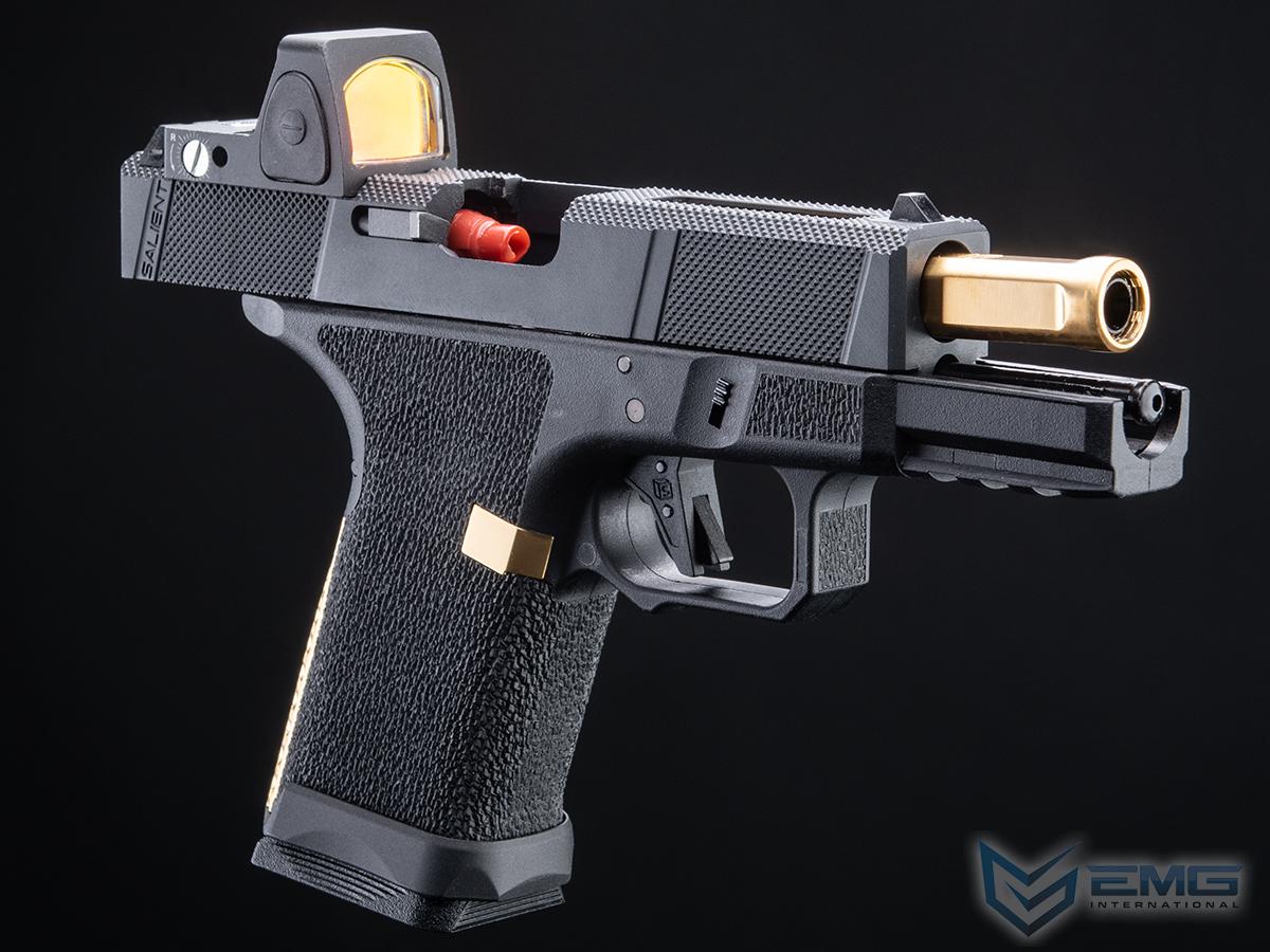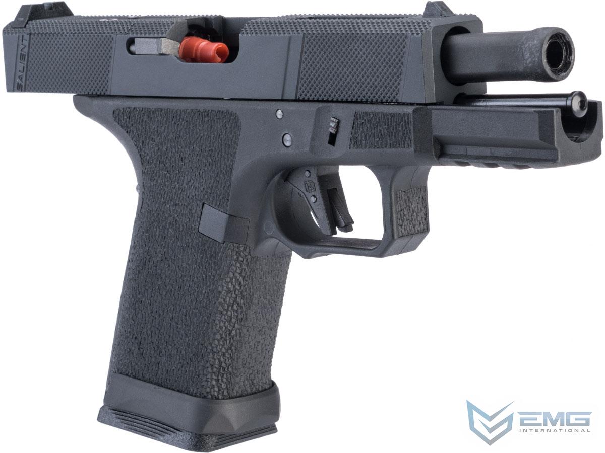 EMG has furthered their collaboration with Salient Arms International with a new pistol as the platform. Designed closely with the geniuses at SAI, the EMG / SAI Tier One Utility Package is designed to be as close to the real thing as possible offering shooters and enthusiasts the most realistic training analog available. Using the popular EMG Salient Arms International BLU Compact as the base, the Tier One Utility Package Pistol features a machined aluminum slide with hyper-aggressive front, rear, and top knurling to greatly improve grip no matter the situation. The Titanium Nitride styled box fluted barrel from Salient Arms comes standard with this pistol. Authentic rollmarks and branding top off the look, making it almost impossible to differentiate the 6mm version, from the 9mm version.