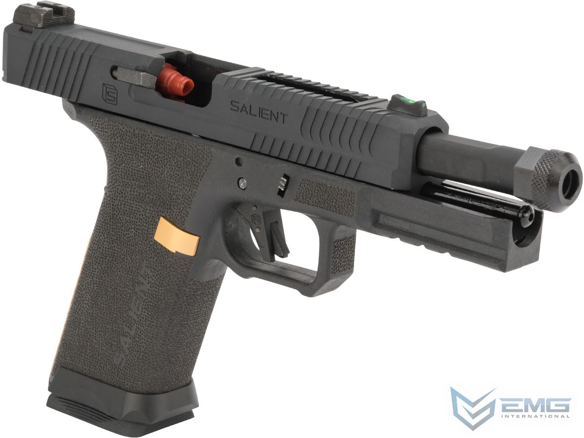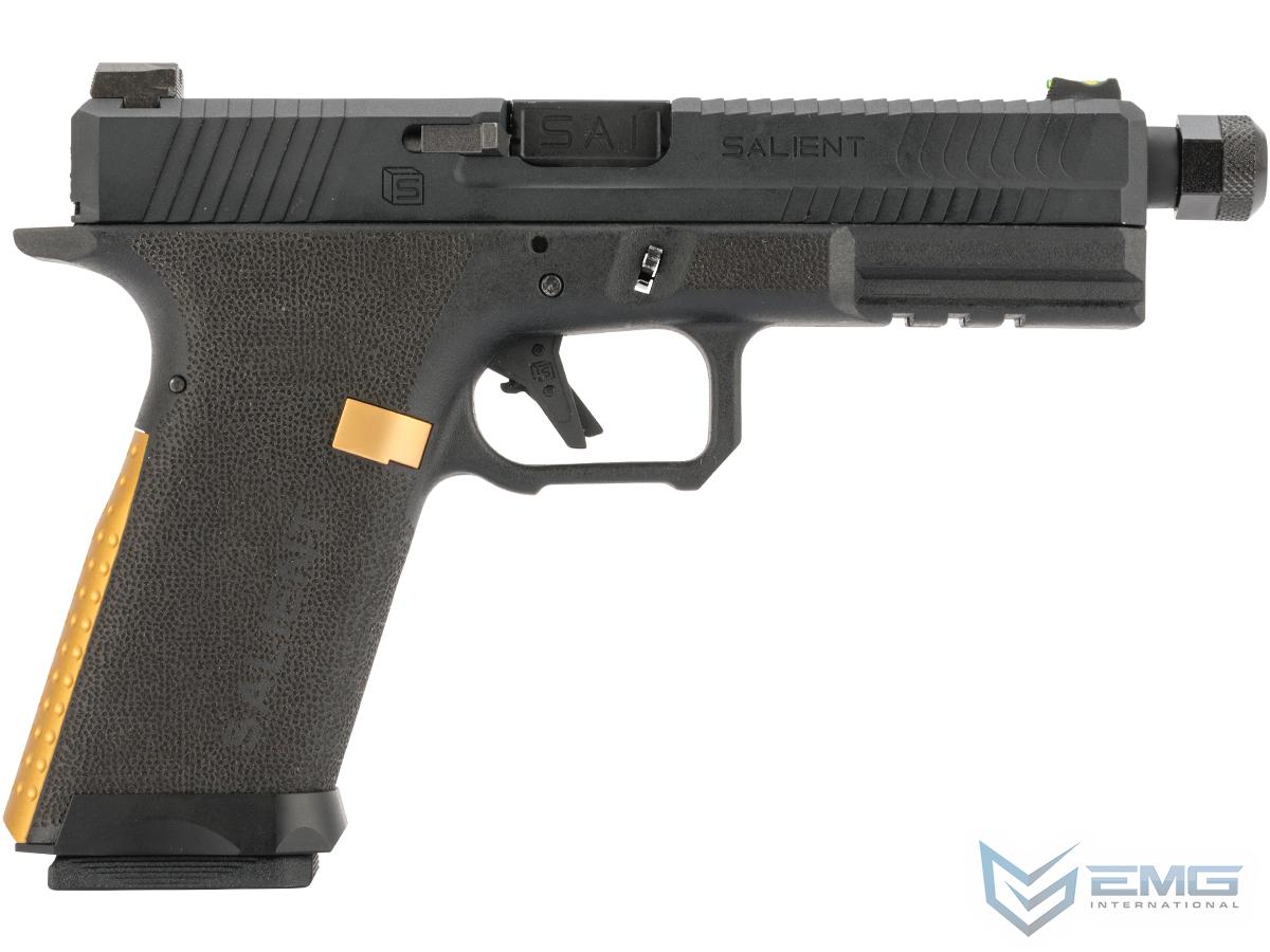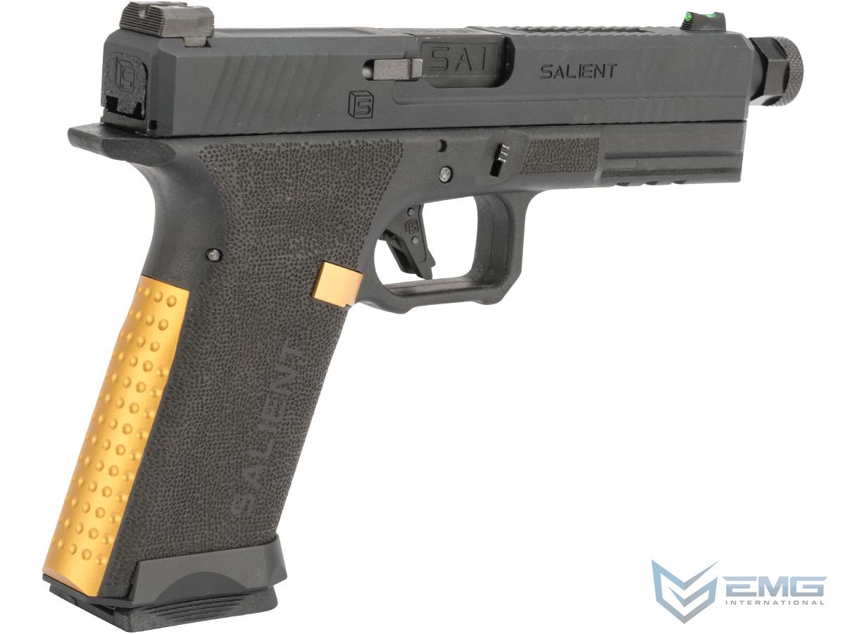 Designed, manufactured and marketed, entirely in house by Salient Arms, the SAI BLU is the first production handgun from SAI. Using feedback from real world users, Salient Arms developed the SAI BLU to fill the void between M&P ergonomics and GLOCK reliability. With aggressive cocking serrations, ergonomically designed grip and trigger guard and interchangeable backstraps the SAI BLU is designed to perform under the most rigorous and austere of conditions, no matter what the shooter requires of it.EMG has furthered their collaboration with Salient Arms International with the long awaited EMG BLU. Designed closely with the geniuses at SAI, the EMG / SAI BLU is designed to be as close to the real thing as possible offering shooters and enthusiasts the most realistic training analog available. Featuring a durable polymer frame, machined aluminum slide and barrel assembly and interchangeable backstraps, the EMG / SAI BLU not only looks like its real deal cousin, it feels like it as well. Authentic rollmarks and branding top off the look, making it almost impossible to differentiate the 6mm version, from the 9mm version.