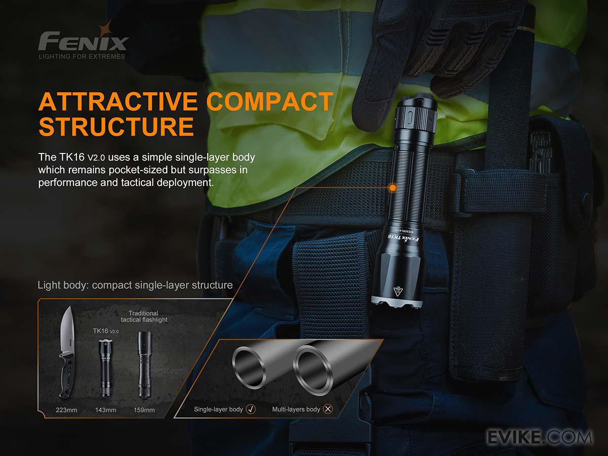 The Fenix TK16 V2.0 is a tactical flashlight featuring incredible performance by throwing a maximum 3100 lumens 1247 feet (380m). Quickly and easily operate the light, and choose between six lighting modes, by using the dual tactical tail switches. It™s durable and rugged with an IP68 dustproof and waterproof rating, plus the stainless steel strike bezel includes tungsten steel breaking tips. Powered by an included rechargeable 5000mAh li-ion battery make the Fenix TK16 V2.0 flashlight your go-to tool for long-lasting tactical performance.